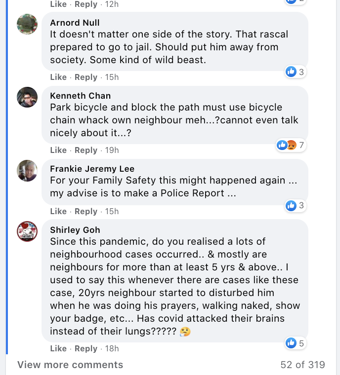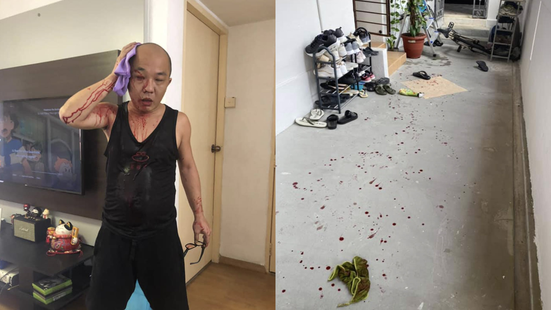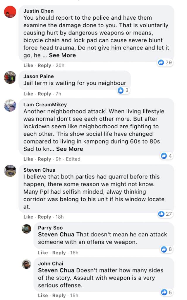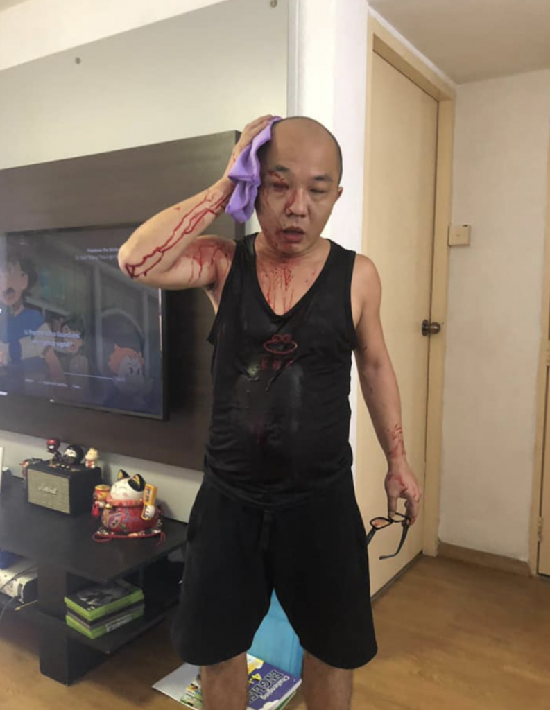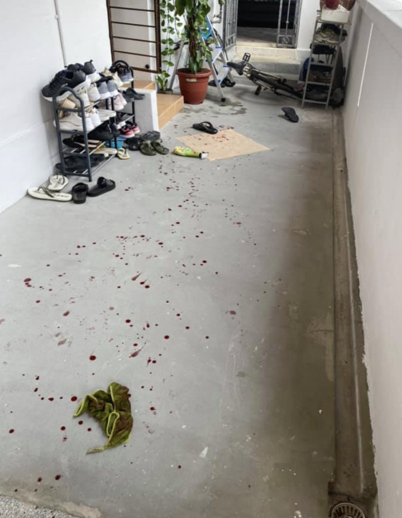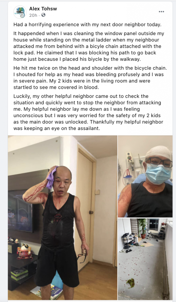Had a horrifying experience with my next door neighbor today. It happended when I was cleaning the window panel outside my house while standing on the metal ladder when my neighbour attacked me from behind with a bicyle chain attached with the lock pad. He claimed that I was blocking his path to go back home just because I placed his biycle by the walkway. He hit me twice on the head and shoulder with the bicycle chain. I shouted for help as my head was bleeding profusely and I was in severe pain. My 2 kids were in the living room and were startled to see me covered in blood.Luckily, my other helpful neighbor came out to check the situation and quickly went to stop the neighbor from attacking me. My helpful neighbor lay me down as I was feeling unconscious but I was very worried for the safety of my 2 kids as the main door was unlocked. Thankfully my helpful neighbor was keeping an eye on the assailant.