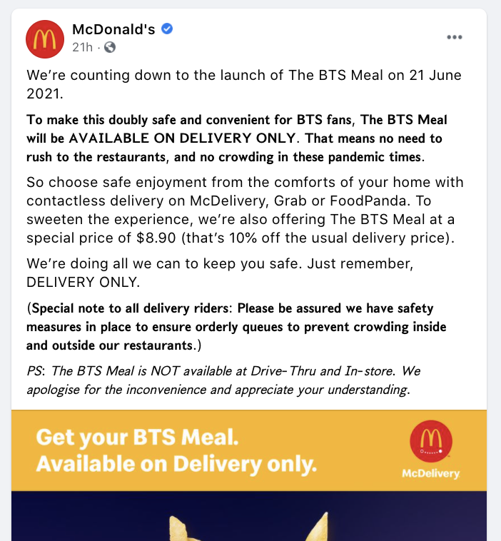 To make this doubly safe and convenient for BTS fans, The BTS Meal will be available on delivery only. That means no need to rush to the restaurants, and no crowding in these pandemic times.