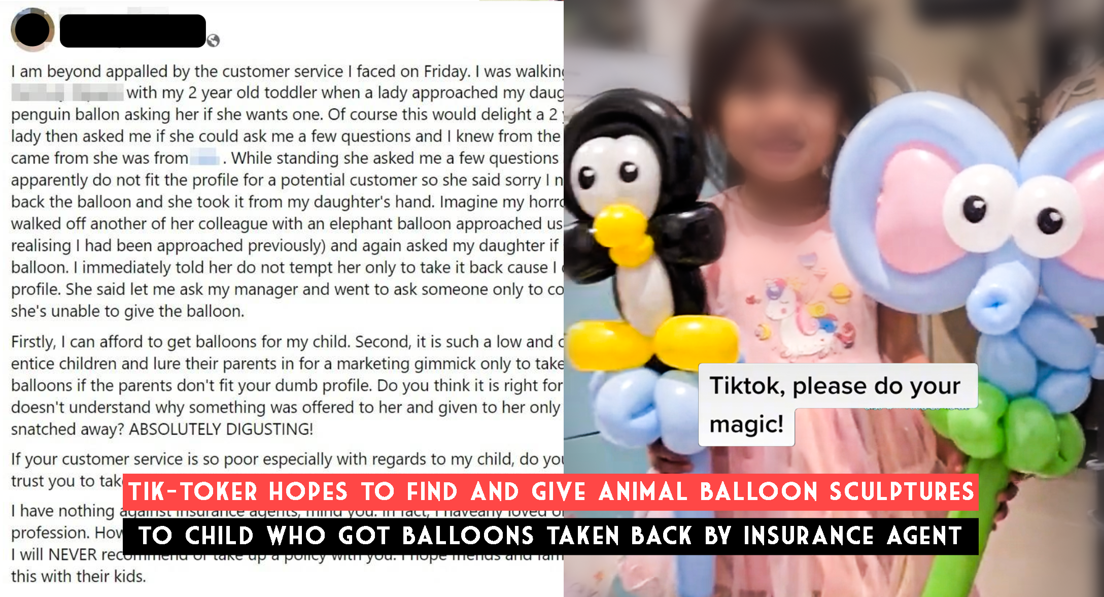 News got to a Singapore Tik Toker, @jocelynballoons, and she is using Tik Tok to find the child and give some animal balloons to her!